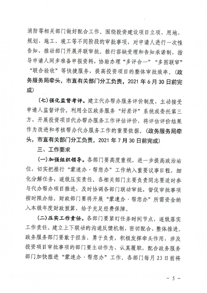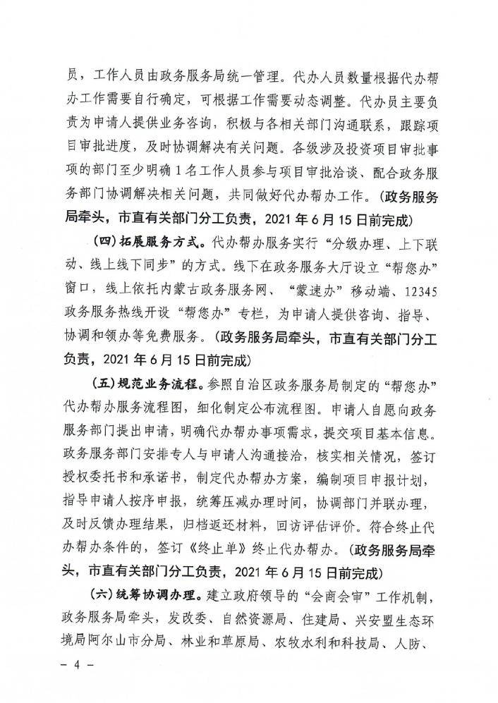 近年来,阿尔山市深入落实《兴安盟工程建设项目审批制度改 革工作实施方案》和《内蒙古自治区人民政府办公厅关于印发全 面推行“蒙速办·帮您办”工作实施方案的通知》等要求,对标区盟一流营商环境,坚持“五减一优”(减事项、减材料 、减环节 、减时间 、减费用、优服务)原则,创新投资项目全链条代办 帮办服务模式 ,力争实现政府投资项目缩减至70个工作日,社会 投资核准类项目缩减至60个工作日,社会投资备案类缩减至 56 个工作日的目标 。
