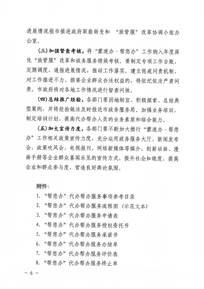六 、在委托代办帮办事项完成 、 审批结果送达后 ,配合填写 《“帮您办”代办帮 办服务办结单》 、 《 “帮您办”代办帮办服务评价表》;