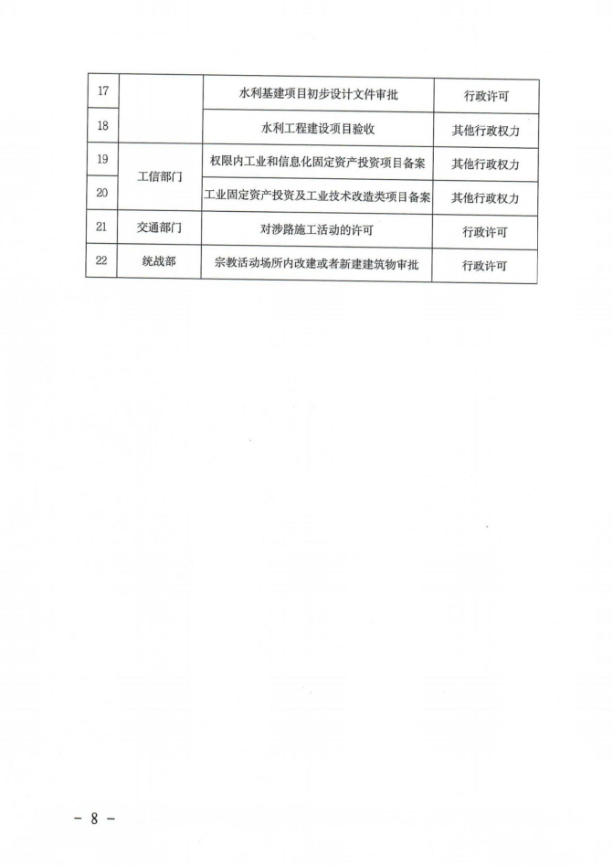 (1)涉及水资源配置调整的其它水事工程及0.1亿立方米以下的水库项目核准;(2)热电站(含自备电站)(抽凝式燃煤热电项目除外);(3)《核准目录(2017)》规定的除国务院投资主管部门、 自治区投资主管部门核准外,其余电网工程项目核准;(4)《核准目录(2017)》规定的除国务院、国家发改委、自治区投资主管部门核准外,其余水电站项目核准;(5)非高速、非国道网、非跨盟市普通省道网公路项目核准(普通省道网项目按照自治区批准的相关规划核准);(6)风电站项目核准;(7)自治区批准的相关规划外的独立铁路桥梁、隧道及非跨大江大河(现状或规划为一级及以上通航段)的独立公路桥梁、隧道项目;(8)自治区内非区域性危险废弃物处理项 目、非区域性医疗垃圾处理项目核准;(9)液化石油气接收、存储设施(不含油气田、 炼油厂的配套项目)项目核准。