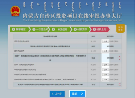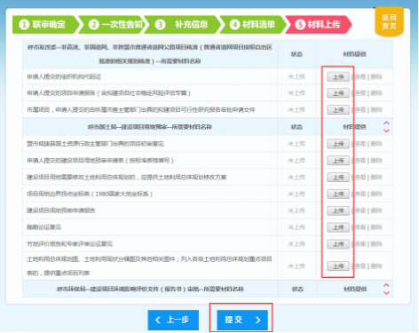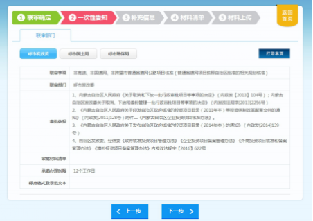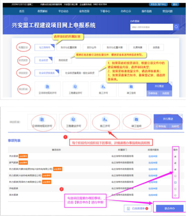 (二)网上申报 。 中请人应通过兴安盟建设项目审批管理系统,按各阶段办事指南要求上传电子申请材料,进行网上申报,对无需同步提交纸质材料的事项, 由管理系统将申请材料自动推送给各并联审批部门,各部门工作人员对电子申请材料进行审查并提出受理意见,通过管理系统反馈申请人。