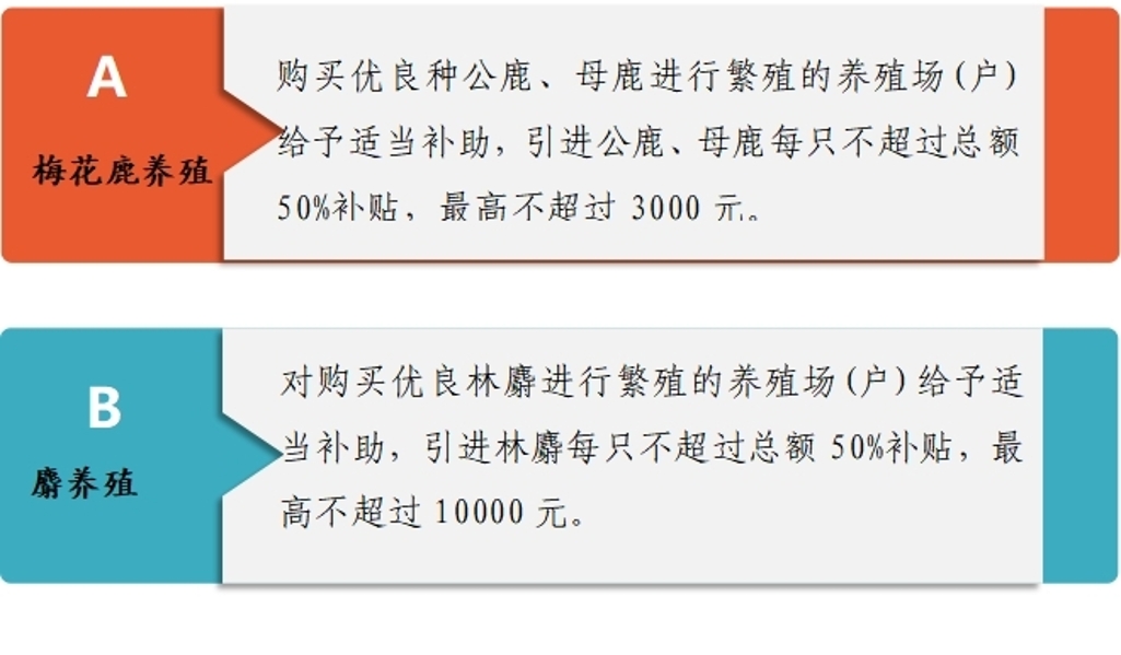 在全市4个乡镇实施以梅花鹿为代表的(包括林麝)养殖补贴,支持养殖场户开展购买优良梅花鹿、林麝进行繁殖。