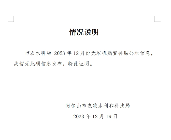 关于阿尔山市2023年12月份无农机购置补贴公示信息的情况说明