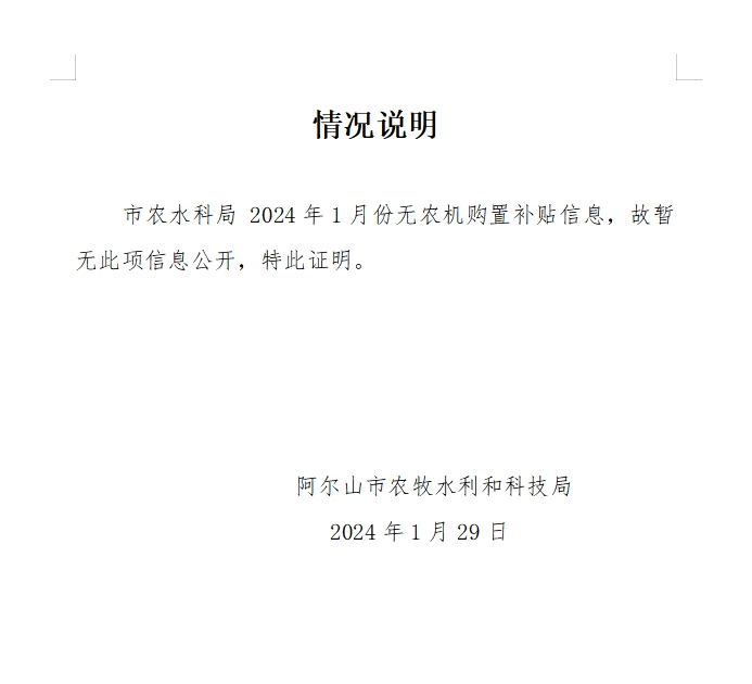 关于阿尔山市2024年1月份无农机购置补贴信息发布的情况说明