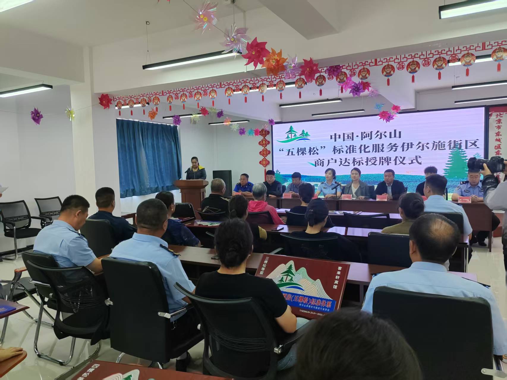 8月13日,阿尔山市市场监督管理局联合市文化旅游体育局、市政府外事办、市餐饮与饭店协会、市文化旅游体育协会,共同举办“中国·阿尔山餐饮、住宿(五棵松)标准体系”伊尔施街区商户获誉企业授牌仪式,为16家在餐饮、住宿服务中表现突出的商户授予“五棵松”等级称号。