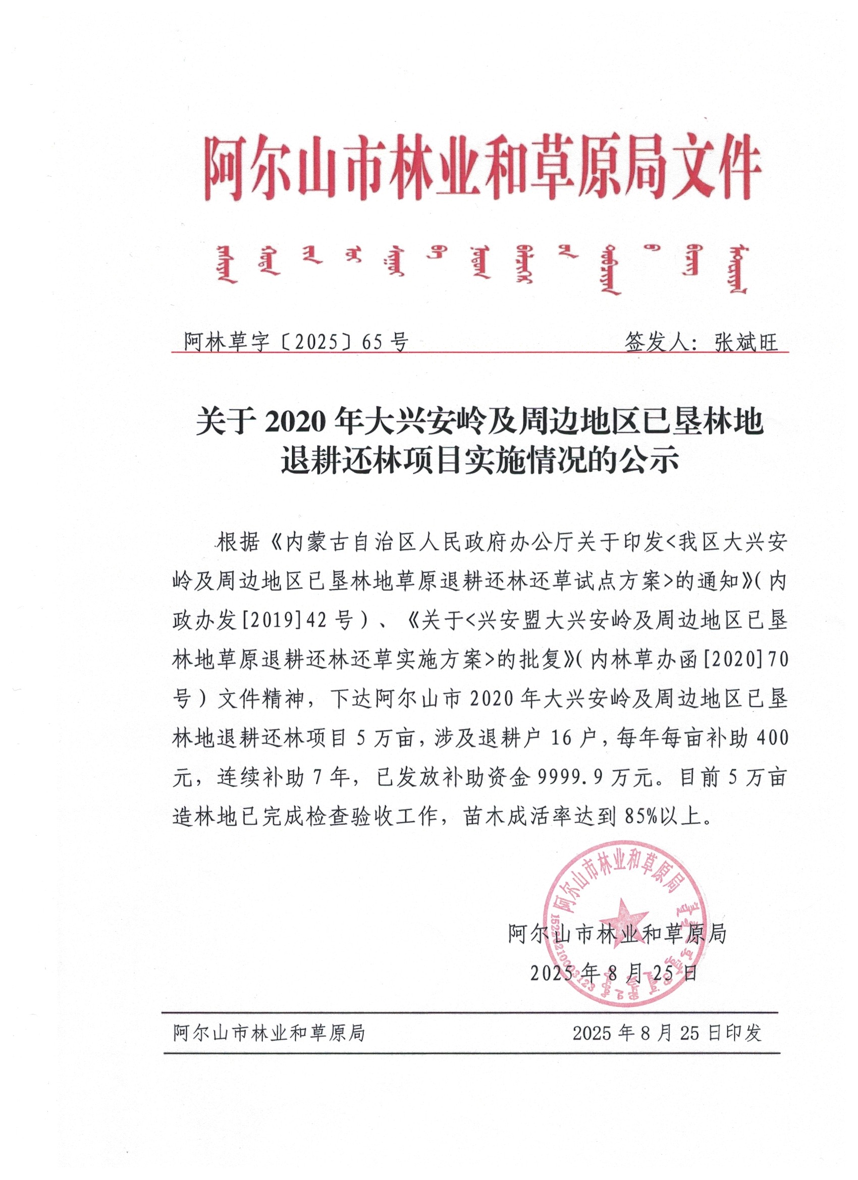 关于2020年大兴安岭及周边地区已垦林地退耕还林项目实施情况的公示