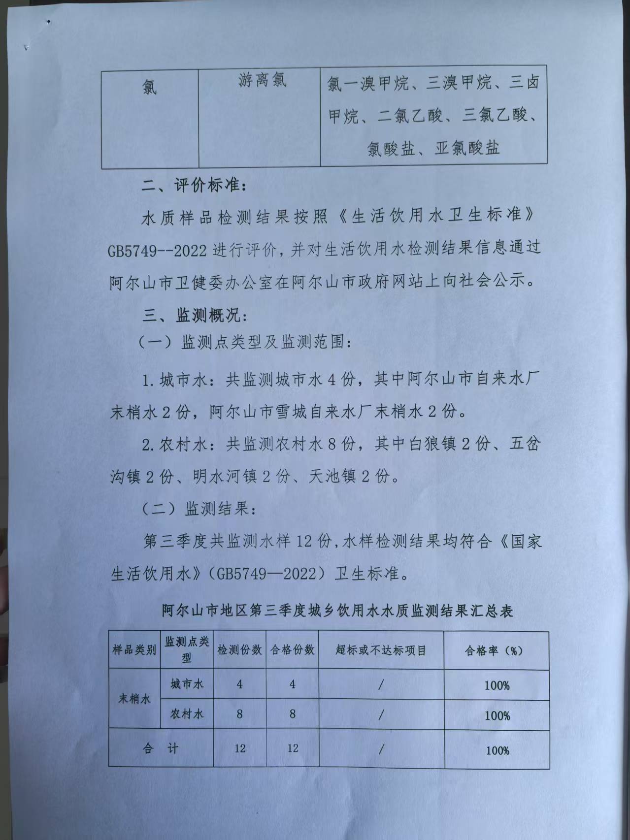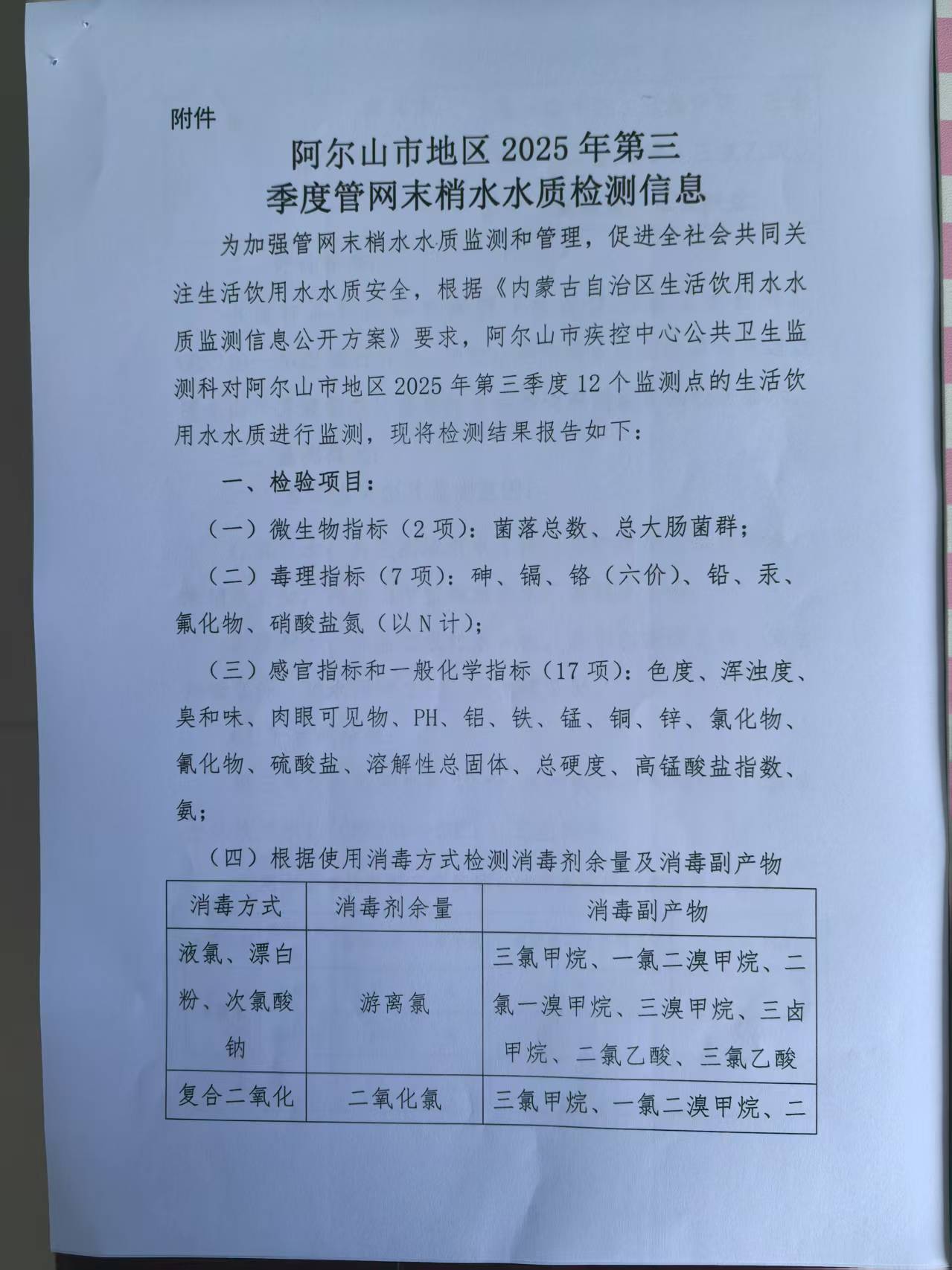【监督检查信息】关于上报《阿尔山市地区2025年第三季度管网末梢水水质检测信息》的报告