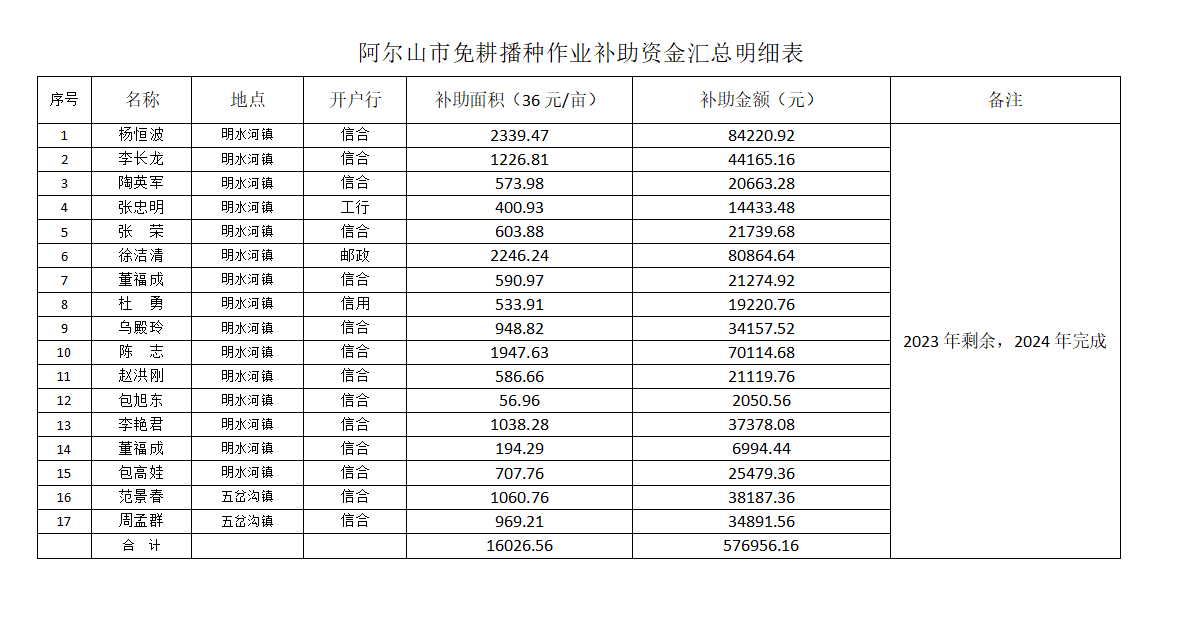 【补贴资金】阿尔山市2023年免耕播种作业补助资金汇总明细表