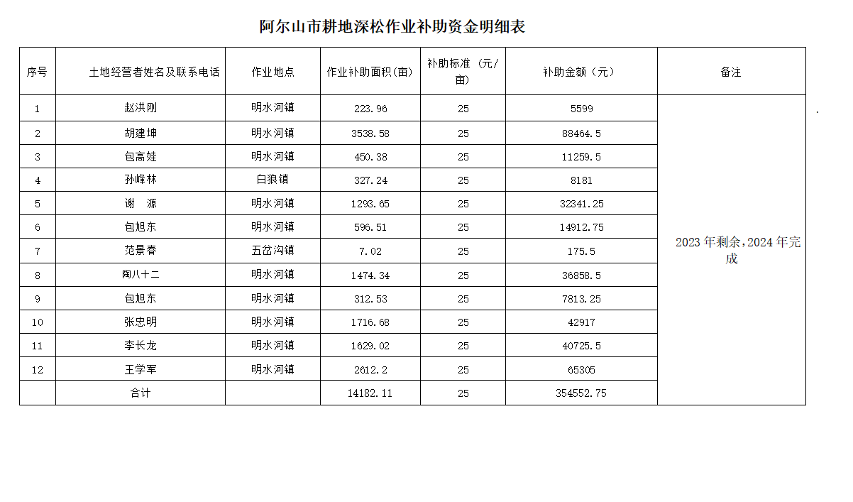 【补贴资金】阿尔山市2023年耕地深松作业补助资金明细表