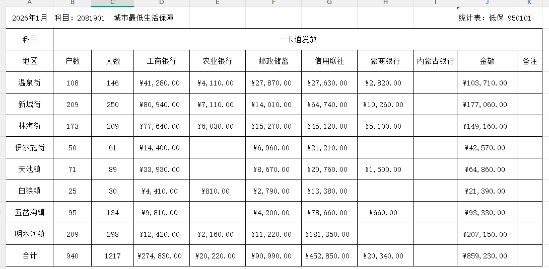 城市最低生活保障低保请款汇总1月