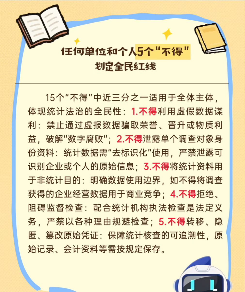 所以,15个“不得”既是不可触碰的法律红线,也是守护数据真实性的“生命线”。唯有各主体严格遵守,才能让统计工作真正服务于经济社会高质量发展,为全面建设社会主义现代化国家提供可靠数据支撑。